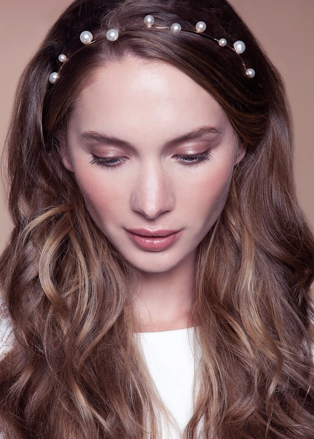 Refresh availabilityA Bridal Hairband made from scattered crystal pearls, finished with a metallic ribbon tie. Our 'Ariel Hairband' features clean lines and luster.