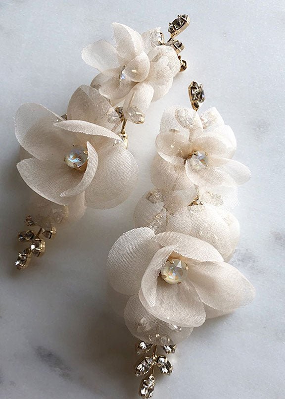 Made from hand pressed silk organza petals hand sewn in our Sydney studio and accented with claw set navette crystals. They're lightweight and lovely enough to wear all for hours on end.