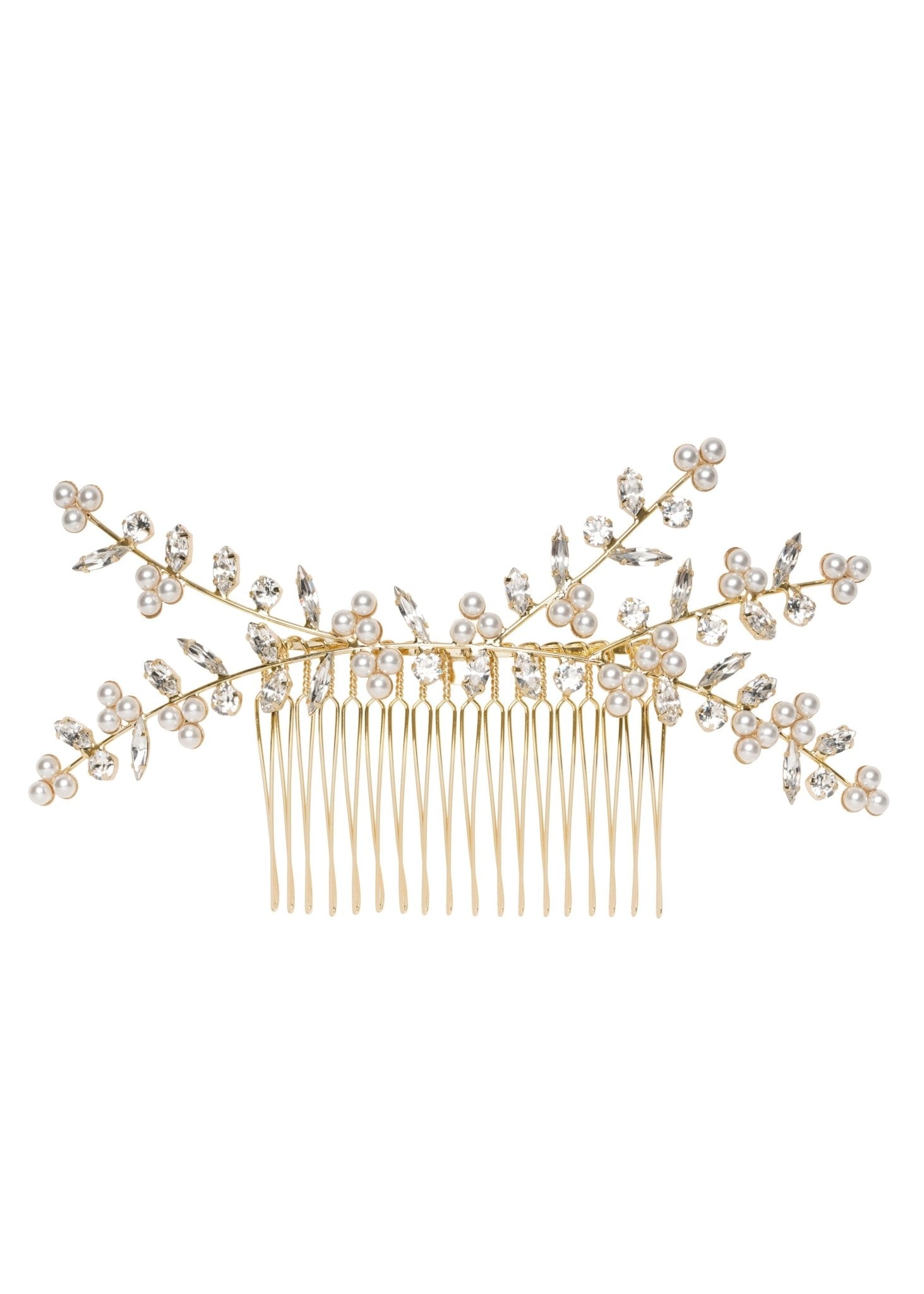 Our Bud Crystal Statement comb features a botanic inspired design made from an assembly of claw set European crystals and pearl accents. A dramatic statement piece to turn heads as your make your entrance. Wear it alone or team it with a pair of out earrings.