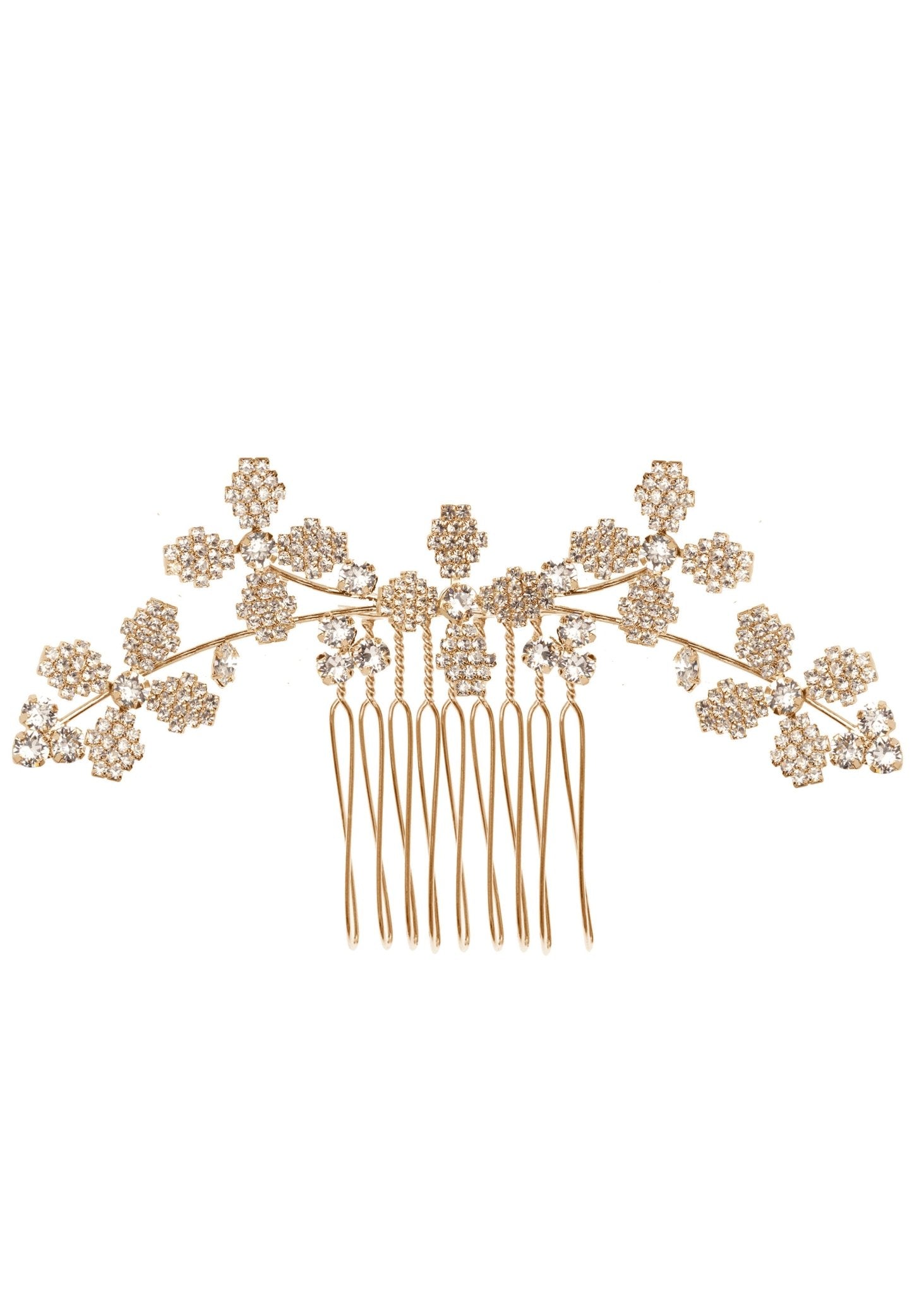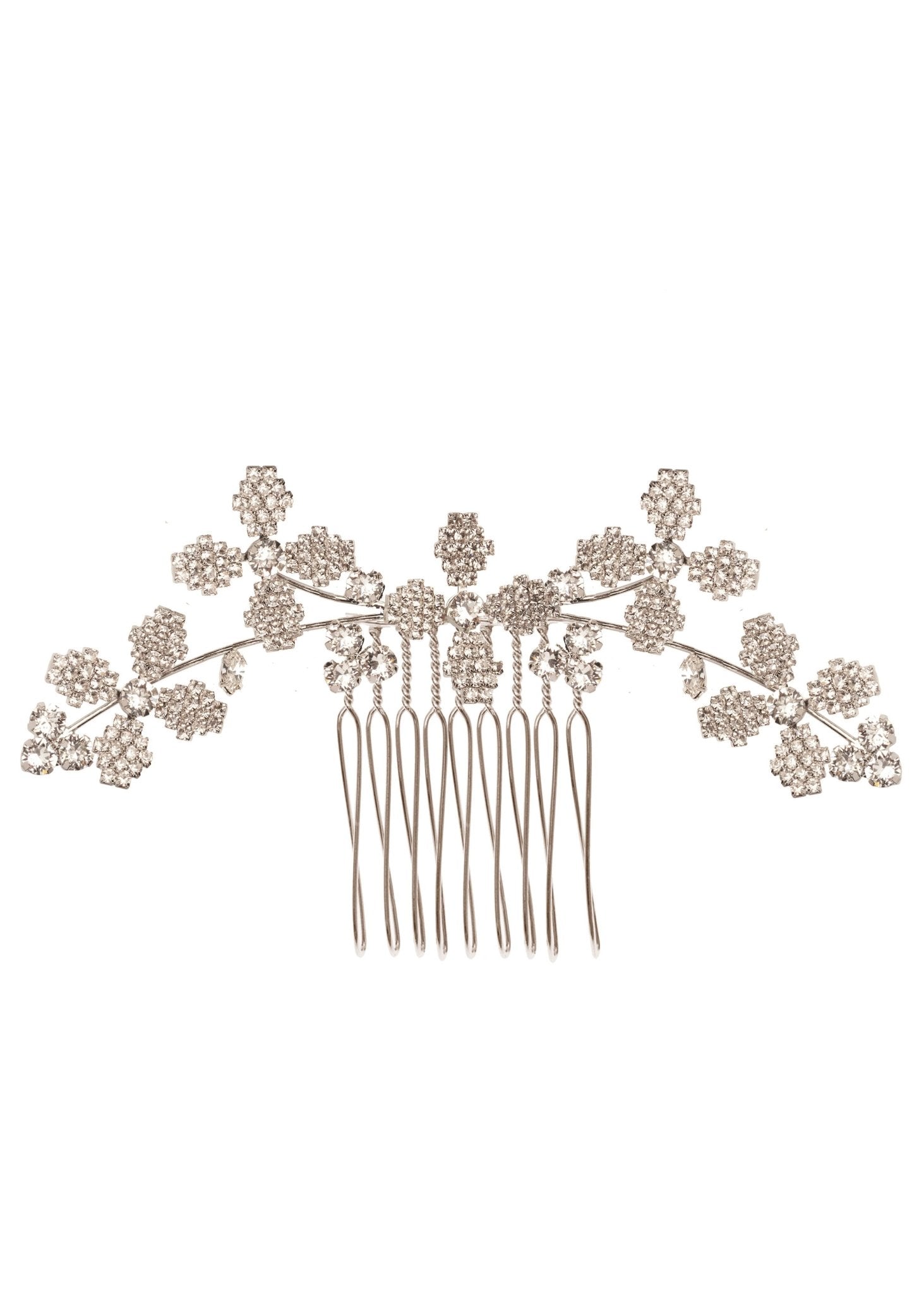 A delicate and dimensional floral crystal hairpiece.