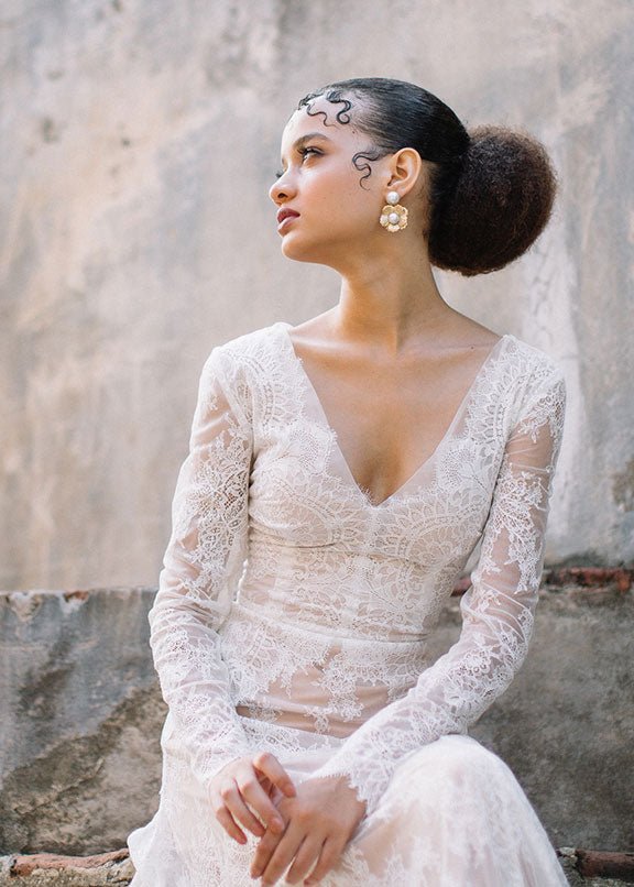 Brass flower stamping accented with German pearl cabochons.