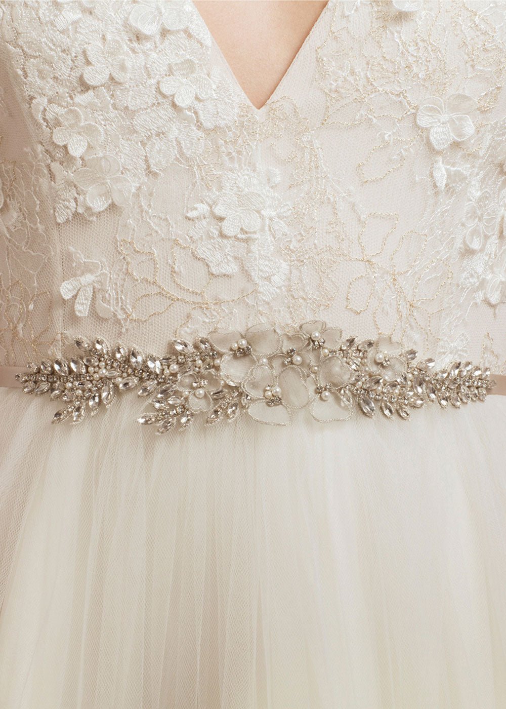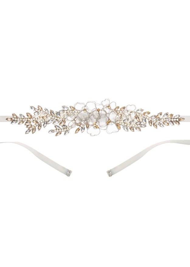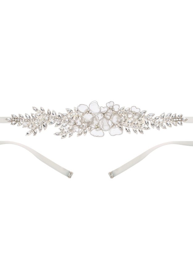 Refresh availabilityA delicate floral dress belt to accent your wedding dress. Made from a floral assembly of metallic edged organza pressed flowers with navette crystal branches and finished with a silk ribbon tie.