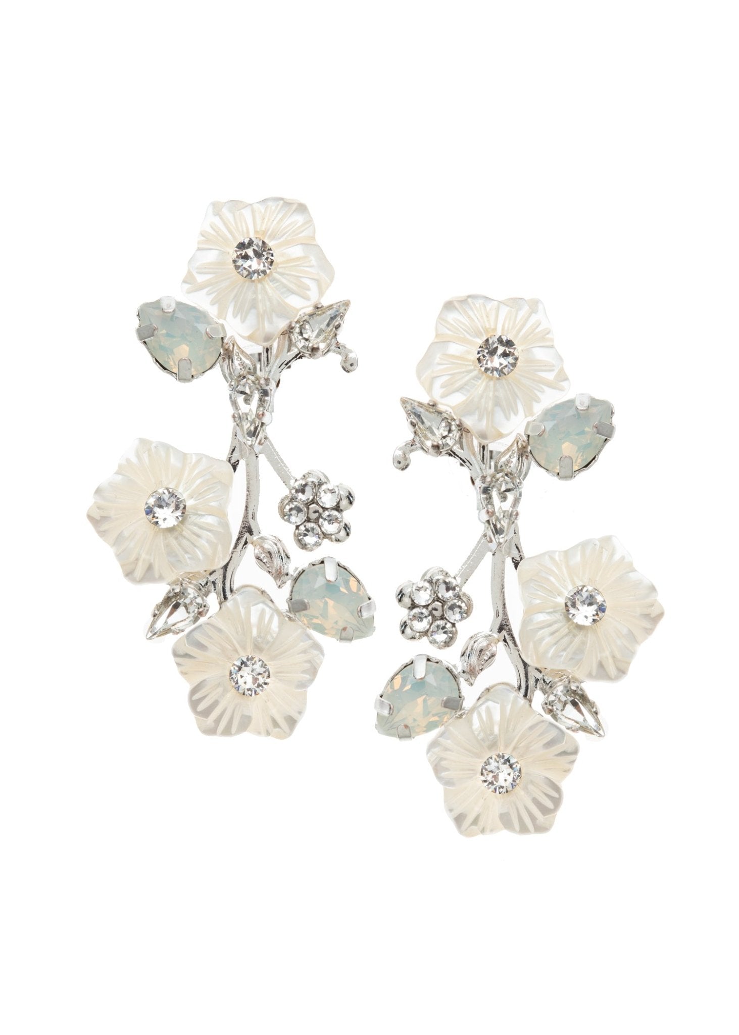Refresh availabilityLuster and sparkle hit all the right notes in these beauties. A beautiful drop earring made from carved mother of pearl flowers facetted crystal stones.