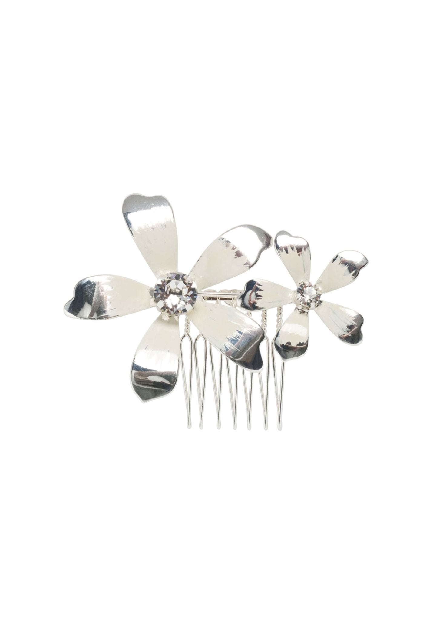 Our 'Hibbi' comb is assembled from pressed metal flowers which are individually hand painted to soft wash across the comb. Completed with crystal accents we think this hair comb will turn heads wherever you go.