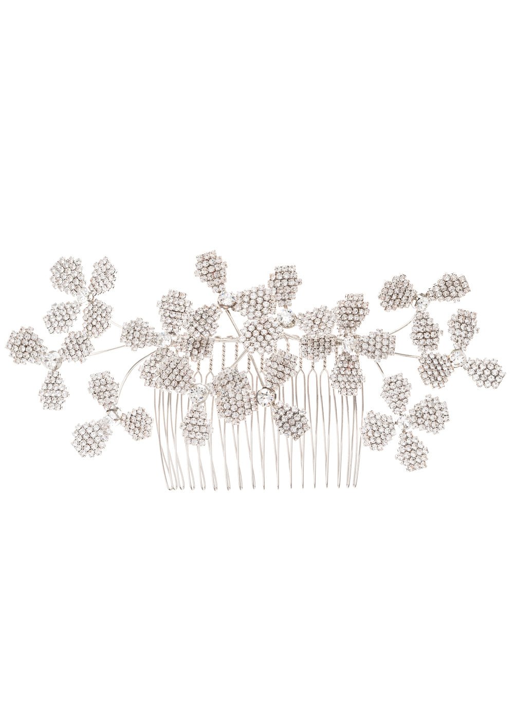 Refresh availabilityA twinkling floral statement comb made from hundreds of claw set European crystals assembled into dimensional flowers. This piece wraps around to create a stunning statement piece to be worn at the back or sides of the hair.