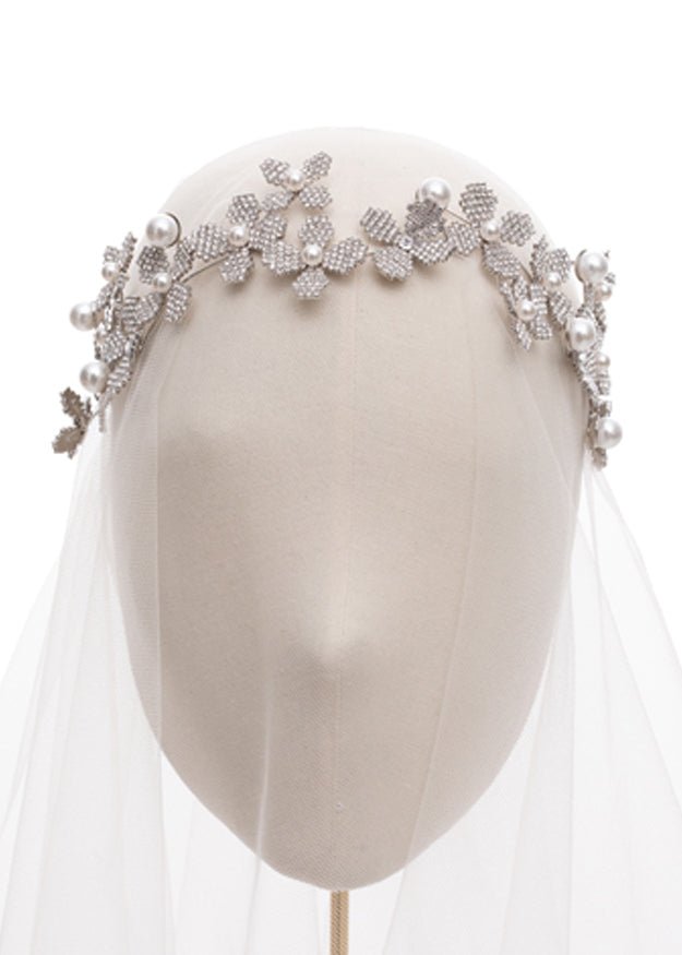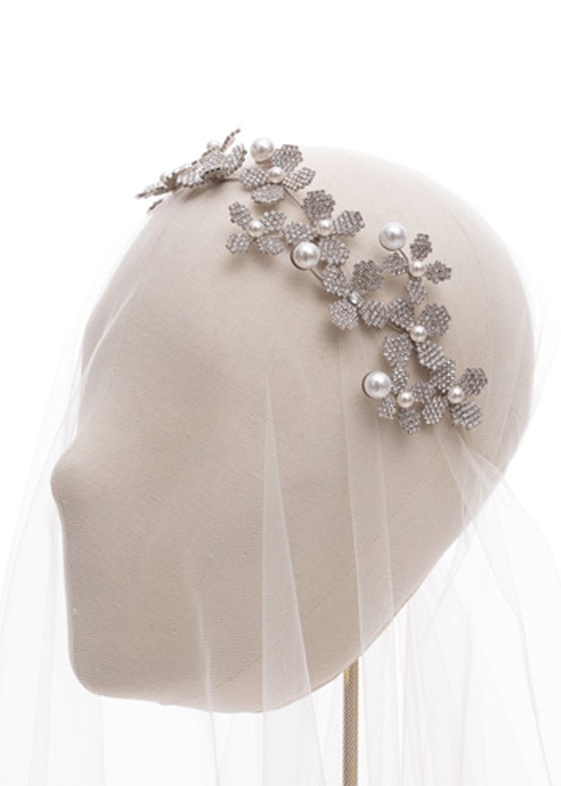 A stunning floral hairpiece for your wedding day. Made from scattered Swarovski crystal flowers and pearl accents.