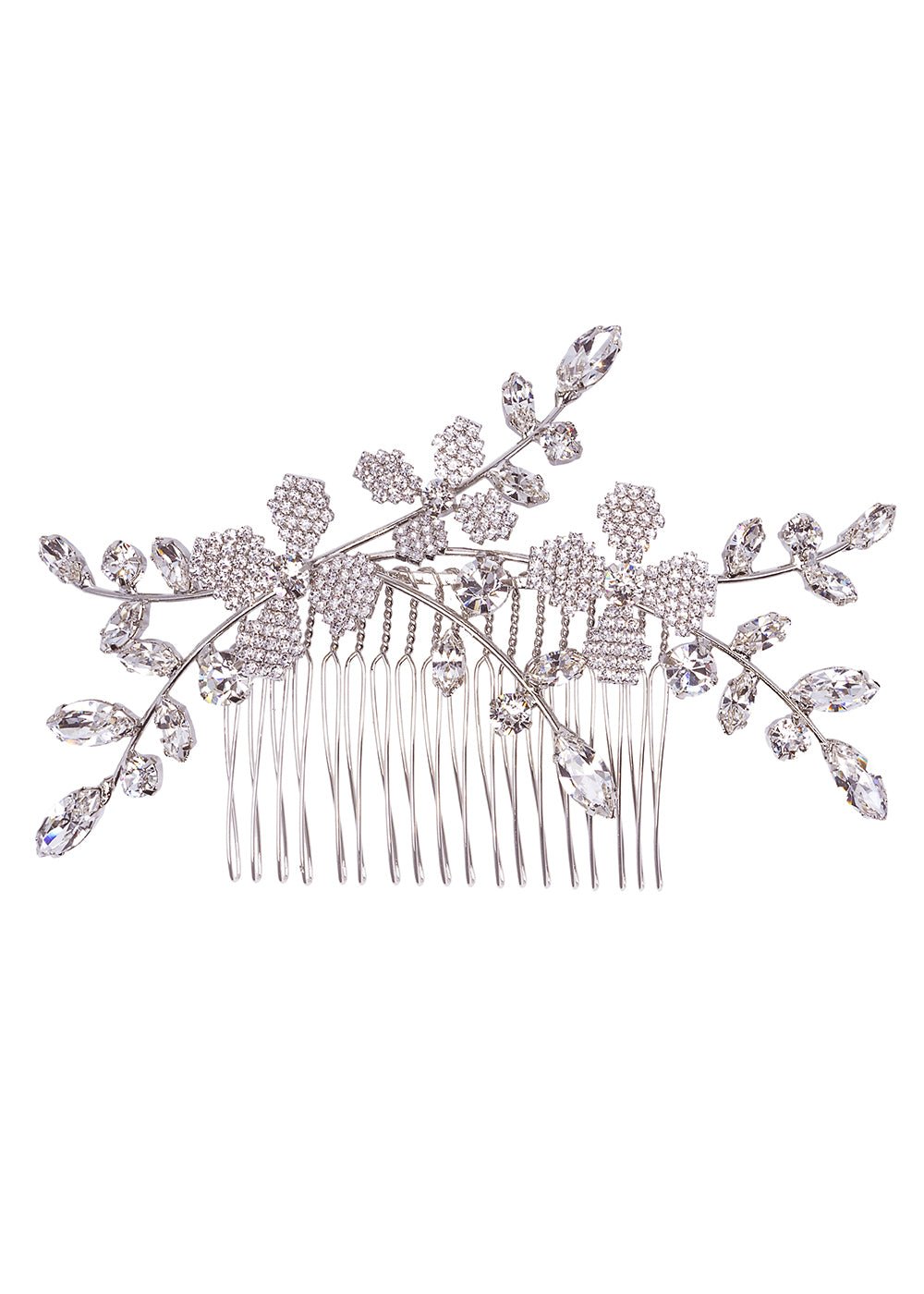 Refresh availabilityA true statement piece if ever there was one! This hair comb is a real head turner, made from an assembly of claw set navette crystals and accented with pave style flowers. Hundreds of tiny claw claw crystals give this piece dimension and sparkle.