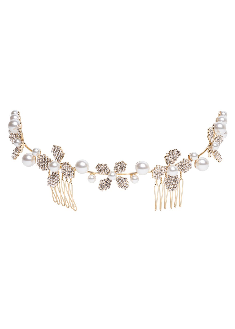 Refresh availabilityThe simple base wire allows the crystals pearls to float effortlessly amidst your hair. Made from pave style crystal flowers and accented with pearls.