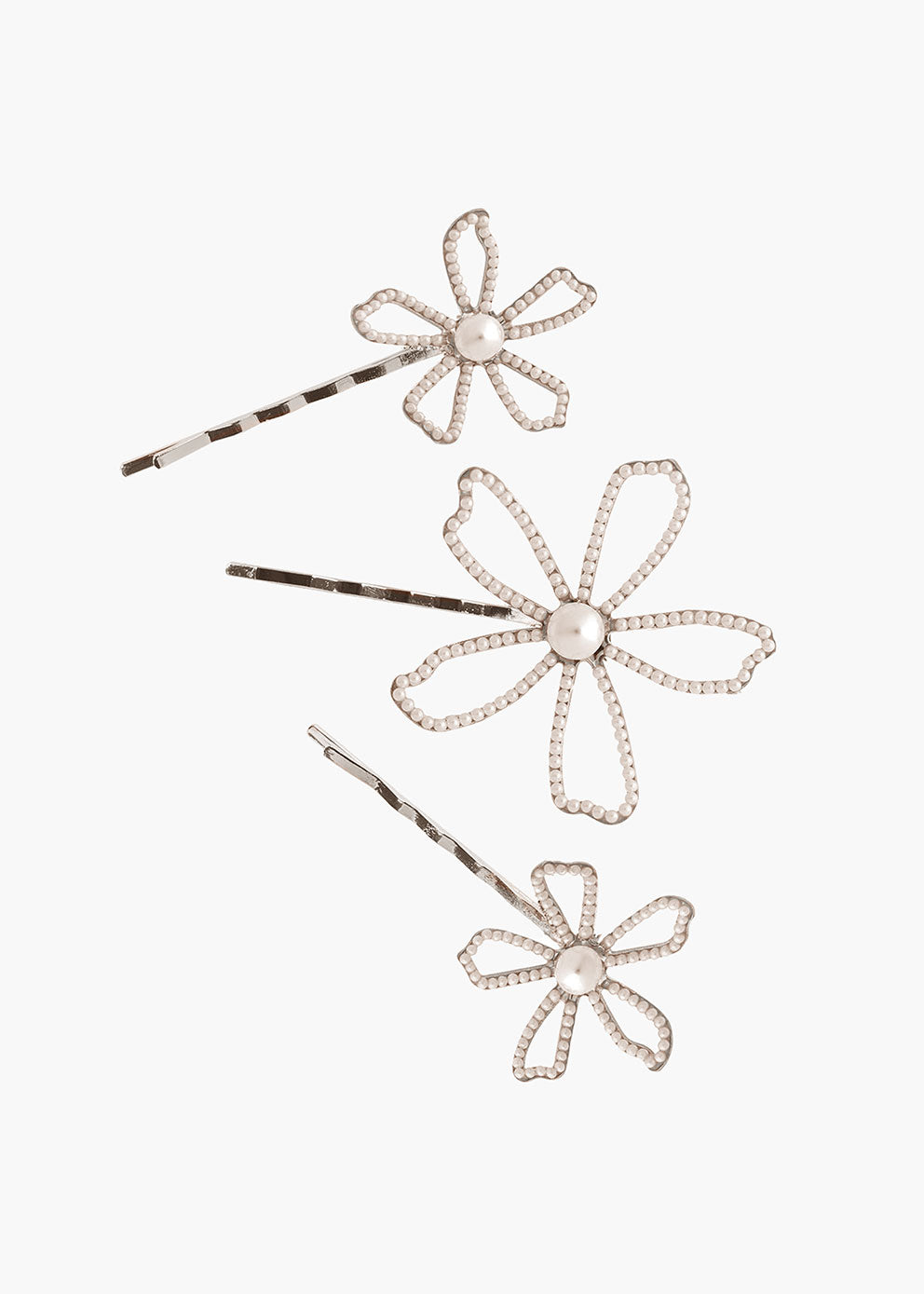 Triple up on luster with this 3 piece set of dimensional floral pearl encrusted hairpins.