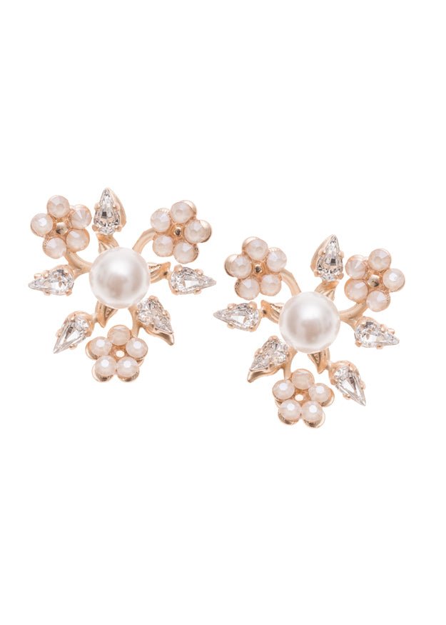 A sweet earrings designed with dimension and luster. Made from a pressed brass floral base accented with claw set crystals and lustrous pearl center.