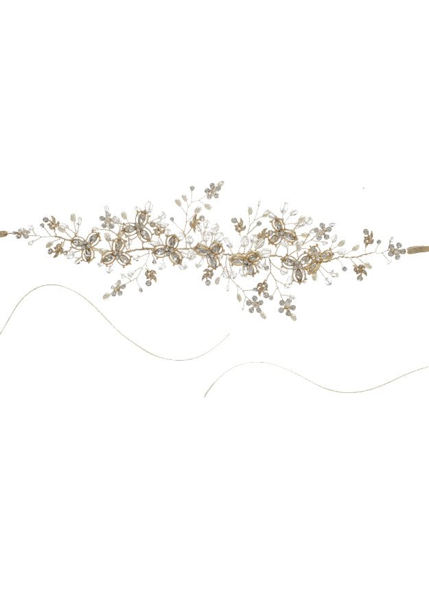 Refresh availabilityA hair piece made from a delicate assembly of wire wrapped pearl and crystal accents. Can also be worn as a sash.